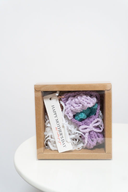手工針織藍色Stitch公仔戴上黑色畢業帽,搭配向日葵、藍玫瑰、白色鬱金香及多種藍白系編織小花,包裝以藍色包花紙與白色絲帶,適合畢業禮物與特別訂製花束。